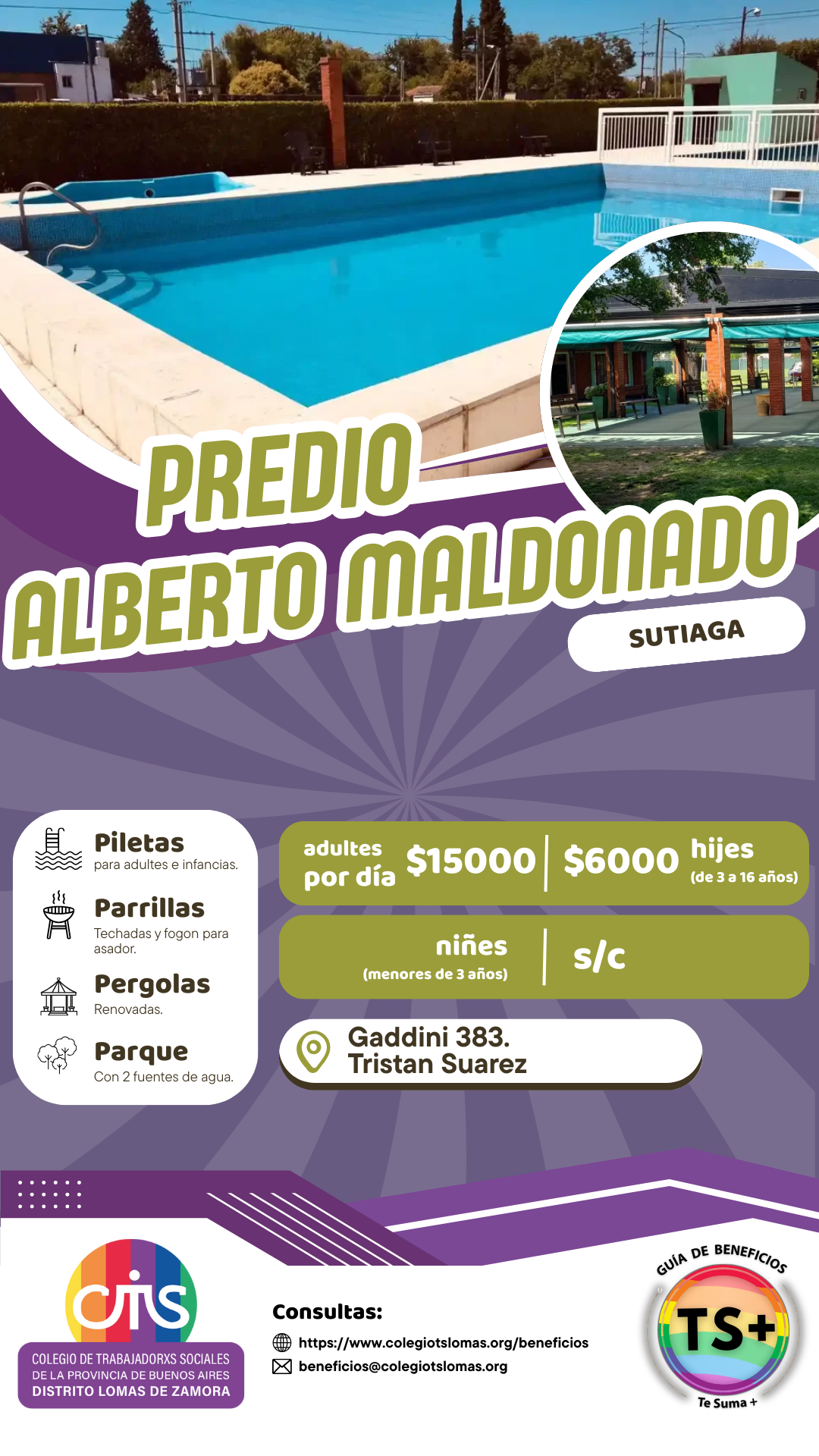 El Predio Alberto Maldonado, perteneciente al sindicato SUTIAGA, cuenta con un amplio espacio recreativo destinado al disfrute familiar. El predio dispone de dos piletas para personas adultas y una pileta para niñas y niños, con reposeras y mesas con sombrillas en el sector de piletas. Asimismo, posee un extenso parque tanto en el frente como en la parte posterior del salón, con una gran variedad de árboles y plantas, e incluye dos fuentes de agua.